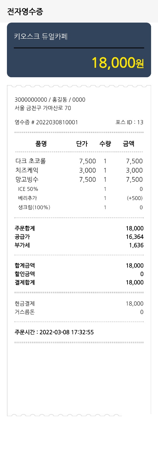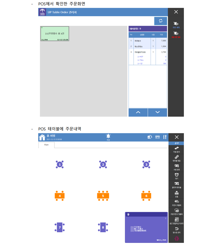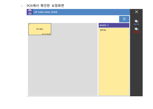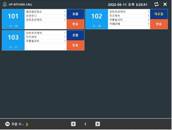 포스 모니터 화면-알림톡으로 호출/완료시 픽업 요청